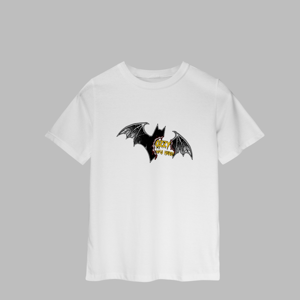 Estilo e rebeldia em forma de camiseta  A estampa traduz essa aura: elementos sombrios, silhuetas de morcego e tipografia impactante que remetem ao metal dos anos 80. É uma peça que carrega a irreverência e o humor ácido de Ozzy, transformando um momento polêmico em símbolo cultural.