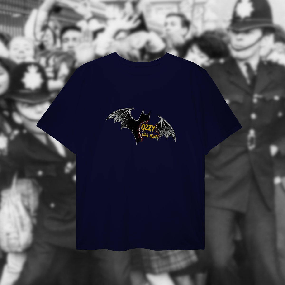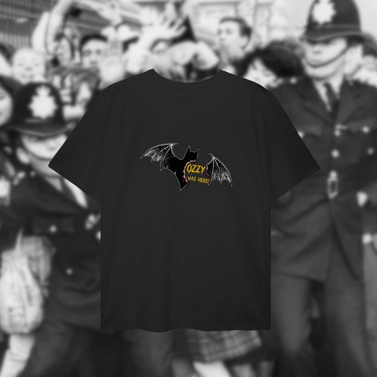 Esta camiseta é uma celebração de um dos episódios mais icônicos e controversos da história do rock: o dia em que Ozzy Osbourne mordeu um morcego lançado ao palco. Mais do que um ato chocante, esse momento cristalizou a imagem de Ozzy como o “Prince of Darkness” e reforçou sua postura de artista que vive o rock como atitude, não apenas como música.