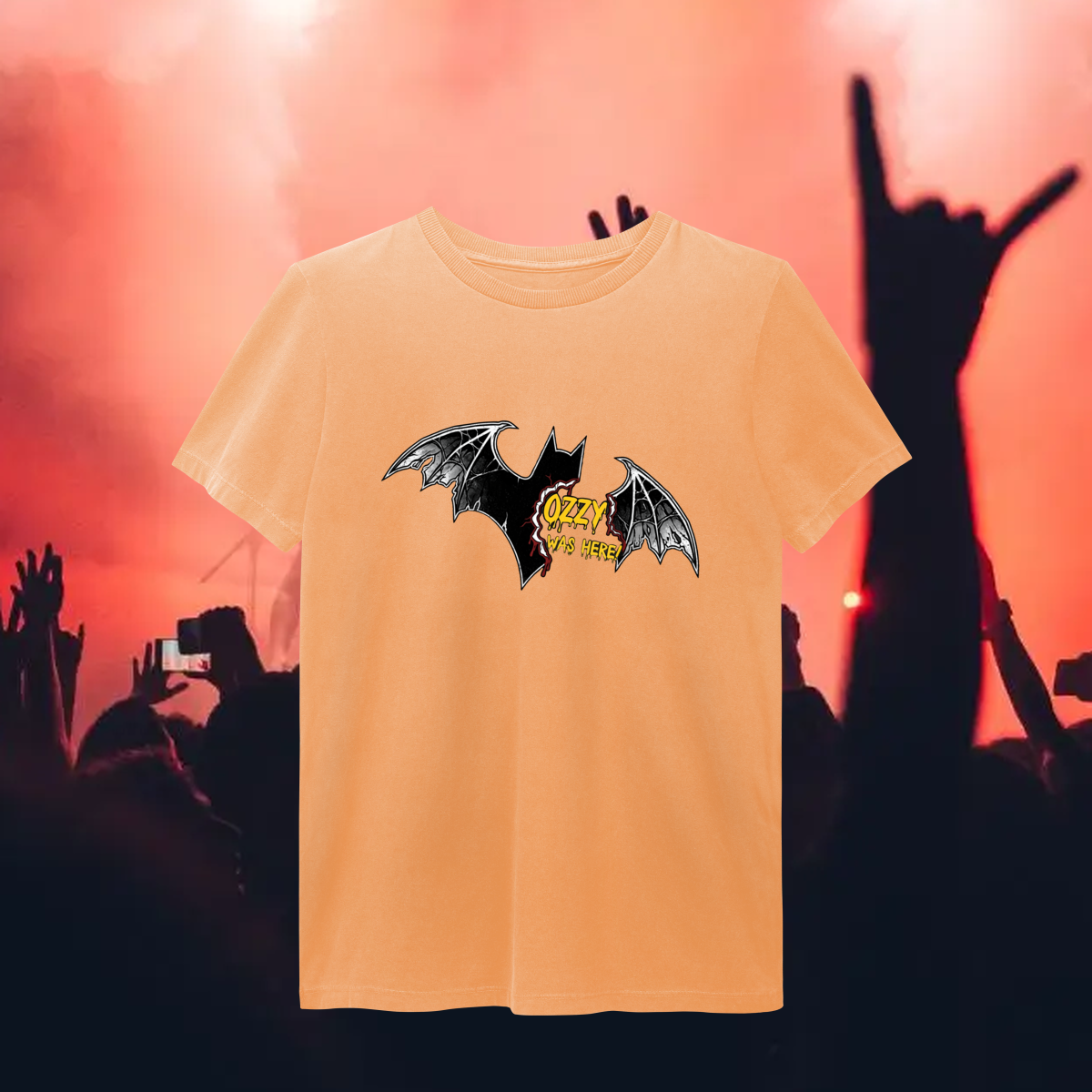 Esta camiseta é uma celebração de um dos episódios mais icônicos e controversos da história do rock: o dia em que Ozzy Osbourne mordeu um morcego lançado ao palco. Mais do que um ato chocante, esse momento cristalizou a imagem de Ozzy como o “Prince of Darkness” e reforçou sua postura de artista que vive o rock como atitude, não apenas como música.